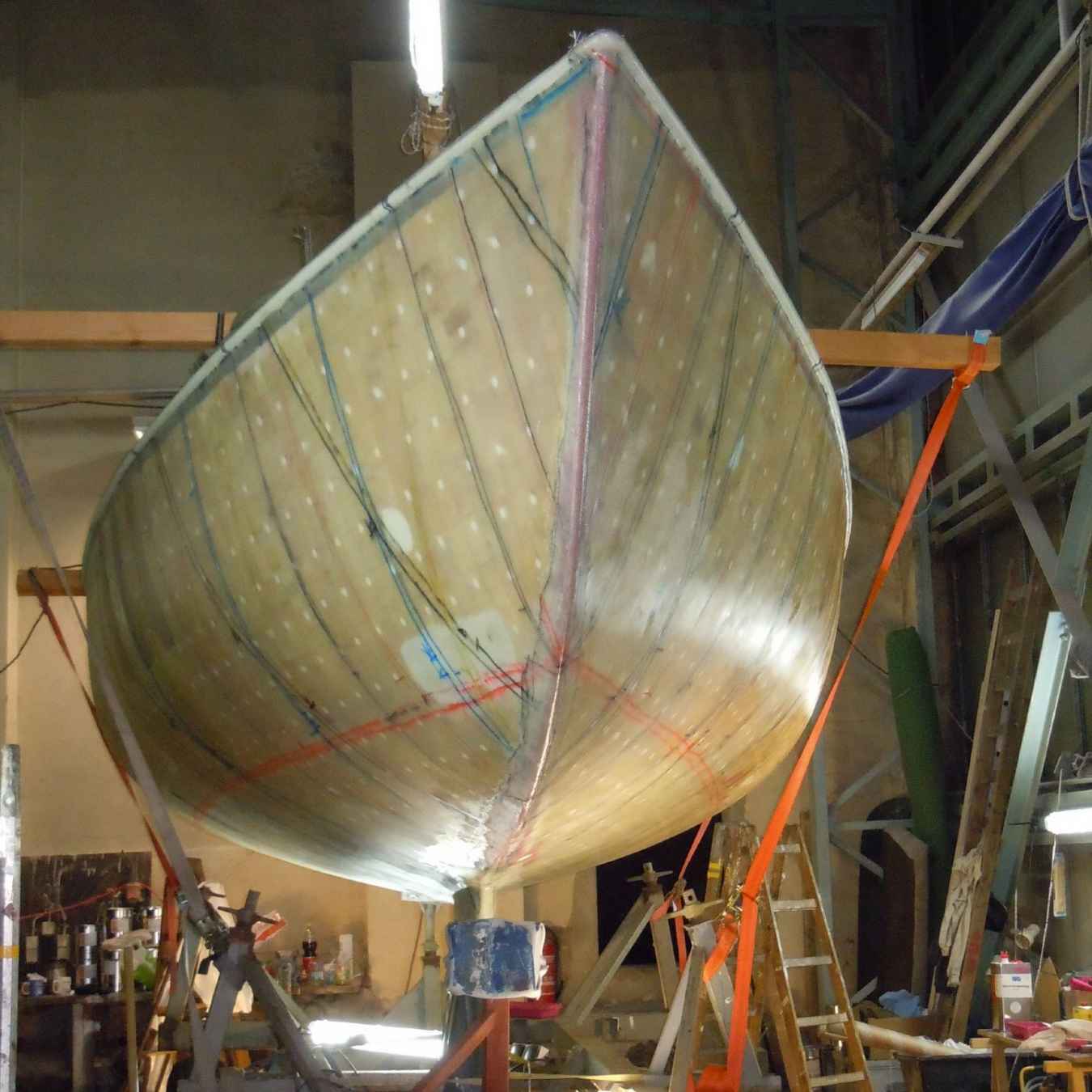 Beim KalkEi handelt es sich um einen Eigenbau in Sandwichbauweise mit einem Balsaholzkern. Es hatte sich die äußere Laminatschicht zu 60% von dem Balsaholz gelöst und das Balsaholz hat Wasser gezogen.