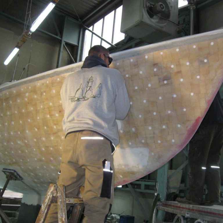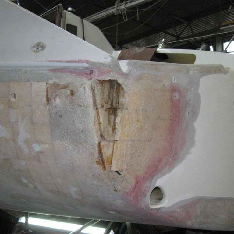 Beim KalkEi handelt es sich um einen Eigenbau in Sandwichbauweise mit einem Balsaholzkern. Es hatte sich die äußere Laminatschicht zu 60% von dem Balsaholz gelöst und das Balsaholz hat Wasser gezogen.